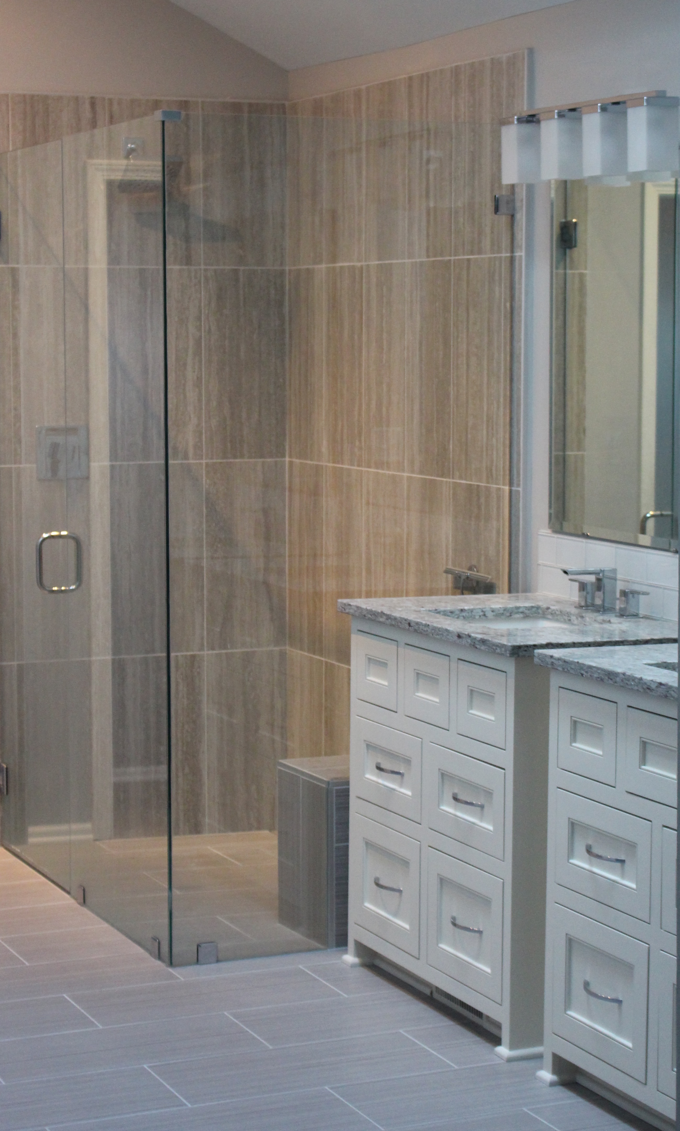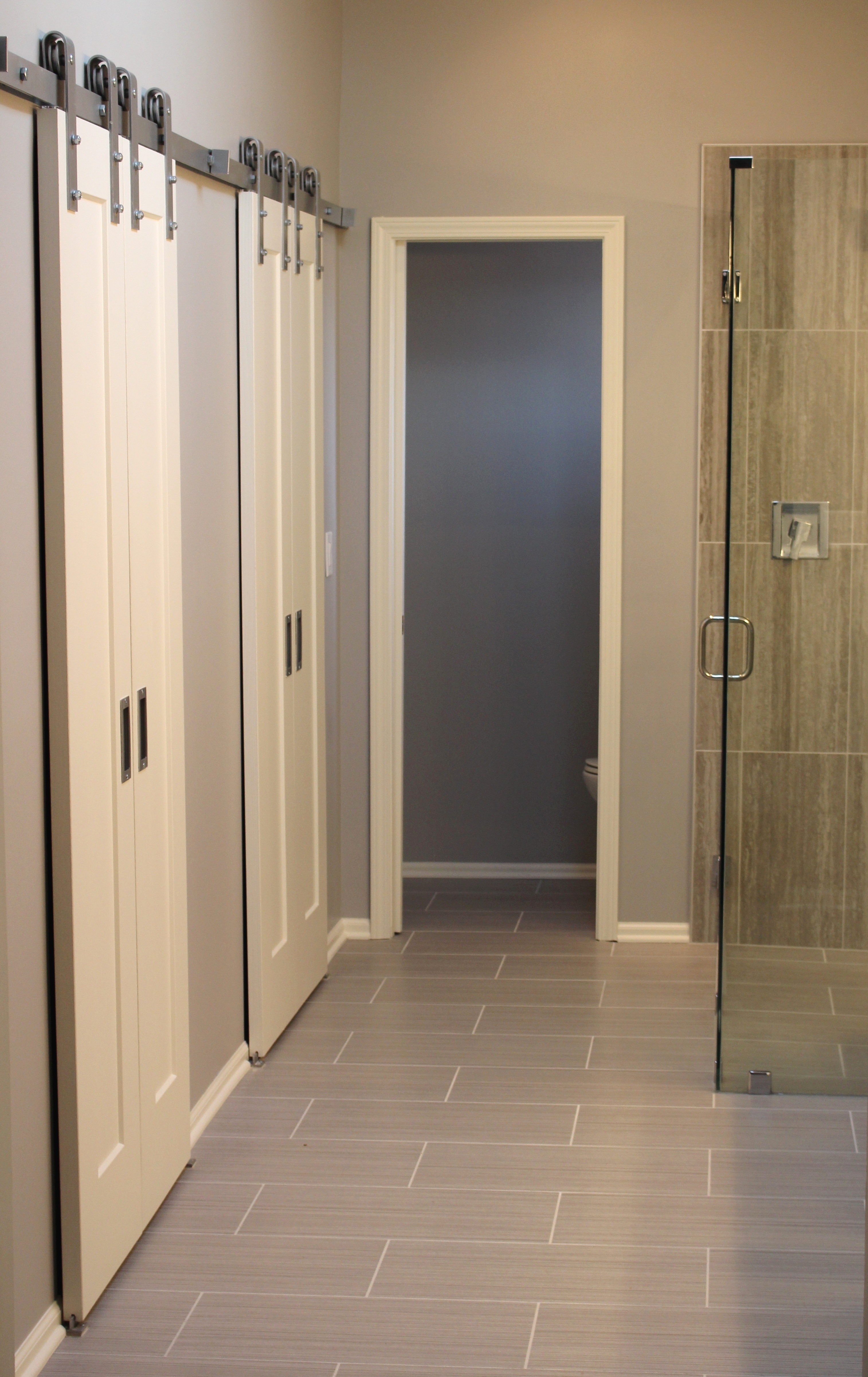 In this bathroom remodel, the clients needed better access to their closet and more room so we added barn doors that could be slide open and shut depending on which part of the closets needed accessed since there wasn’t room for pocket doors.